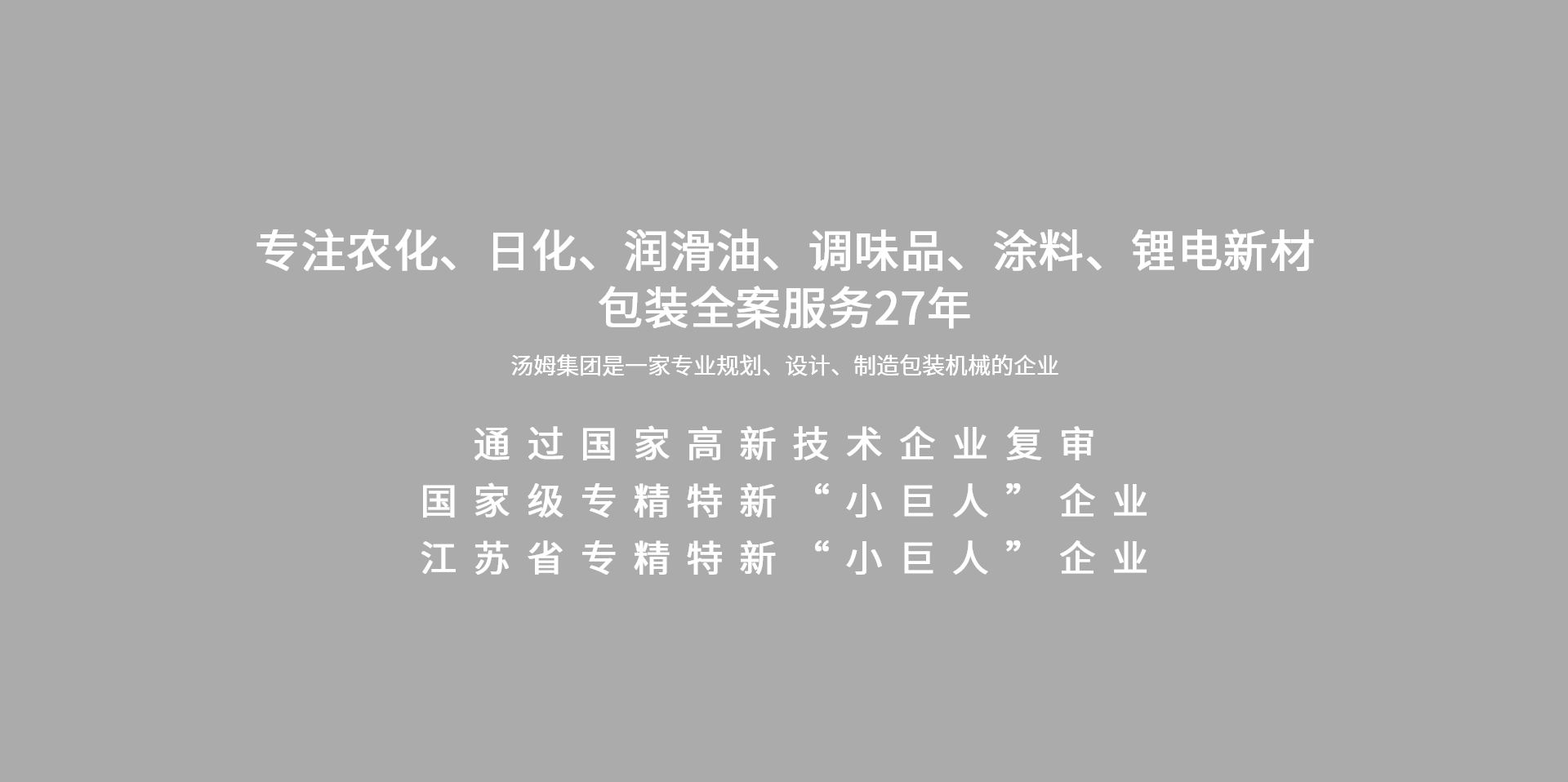 江蘇湯姆集團在液態(tài)、粉體、固體、顆粒等包裝領(lǐng)域的專長保證了工藝設(shè)計與整線工程的完美結(jié)合。建立了農(nóng)化、石化、調(diào)味品、日化、涂料等不同包裝領(lǐng)域的工藝設(shè)計體系,根據(jù)不同的包裝形式及具體的工廠布局,均可提供專為您項目而量身定制的交鑰匙解決方案 。
